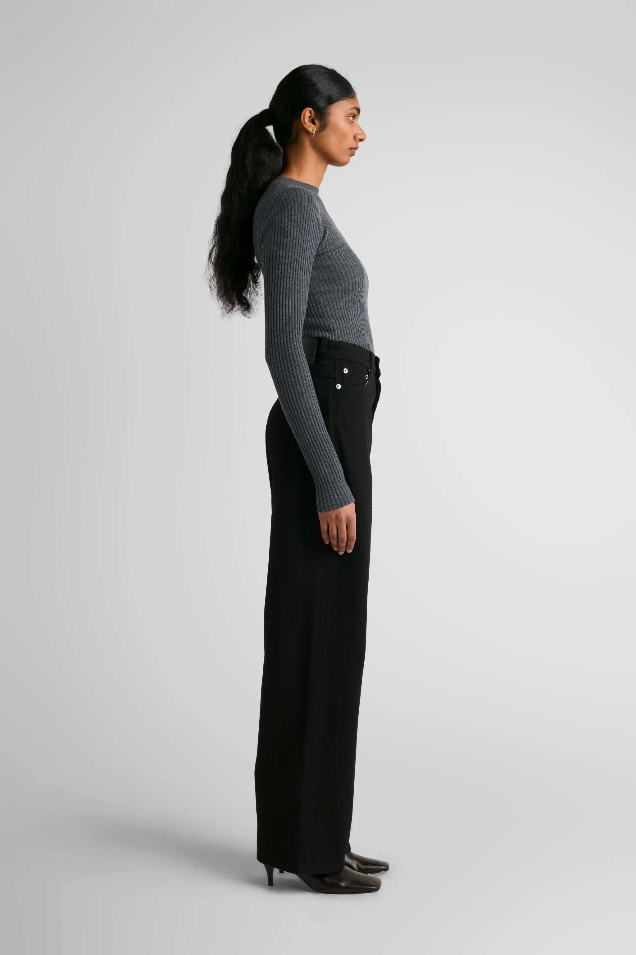 Joelle, our curved high-rise wide fit. Joelle is super high-waisted, curved into the waist and back, with a narrow waistband. Wide and straight from the hips down, with a very subtle taper towards the hem, creating an elegant, elongating wide silhouette.