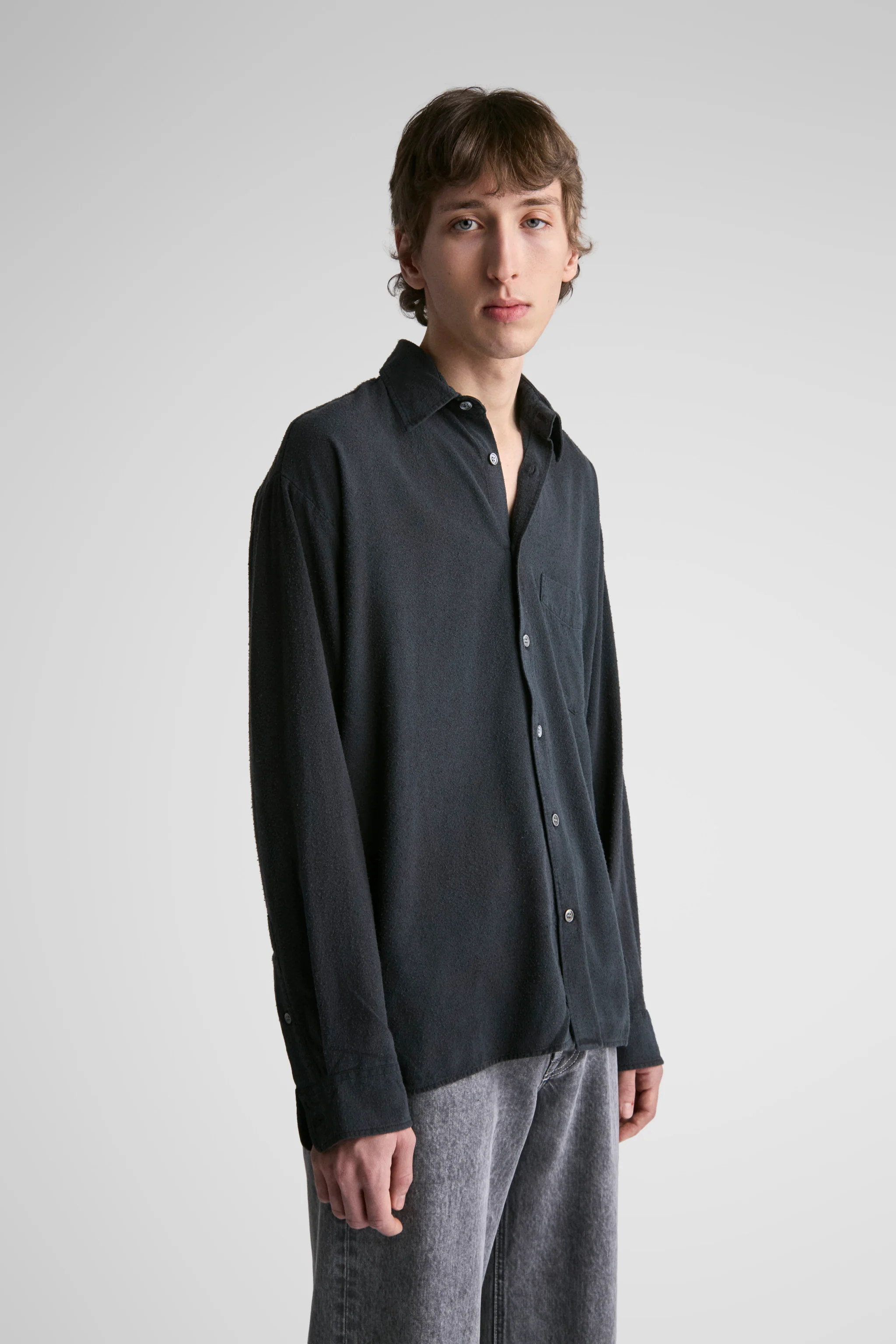 Our box-fit shirt, Keen. Made in a beautiful and soft pure noil silk fabric which combines an organic texture with elegant drape and movement.